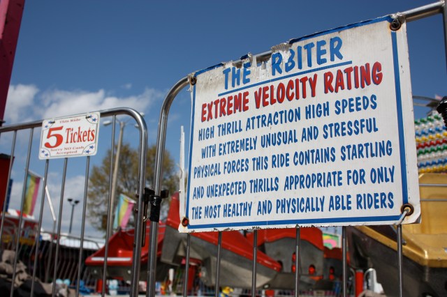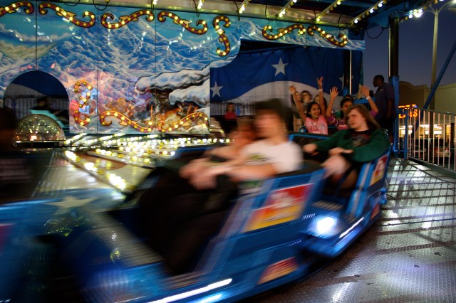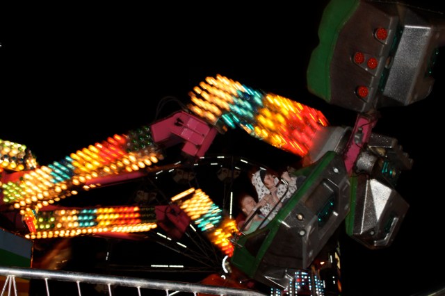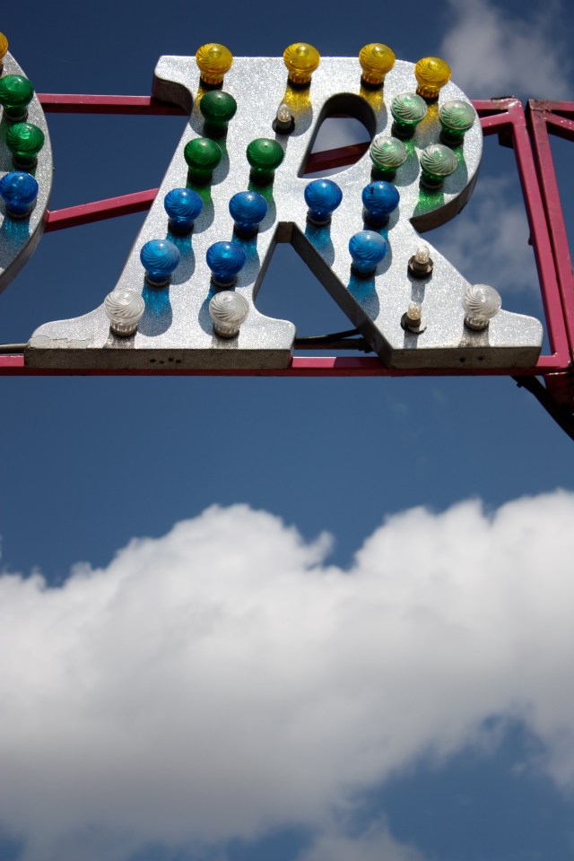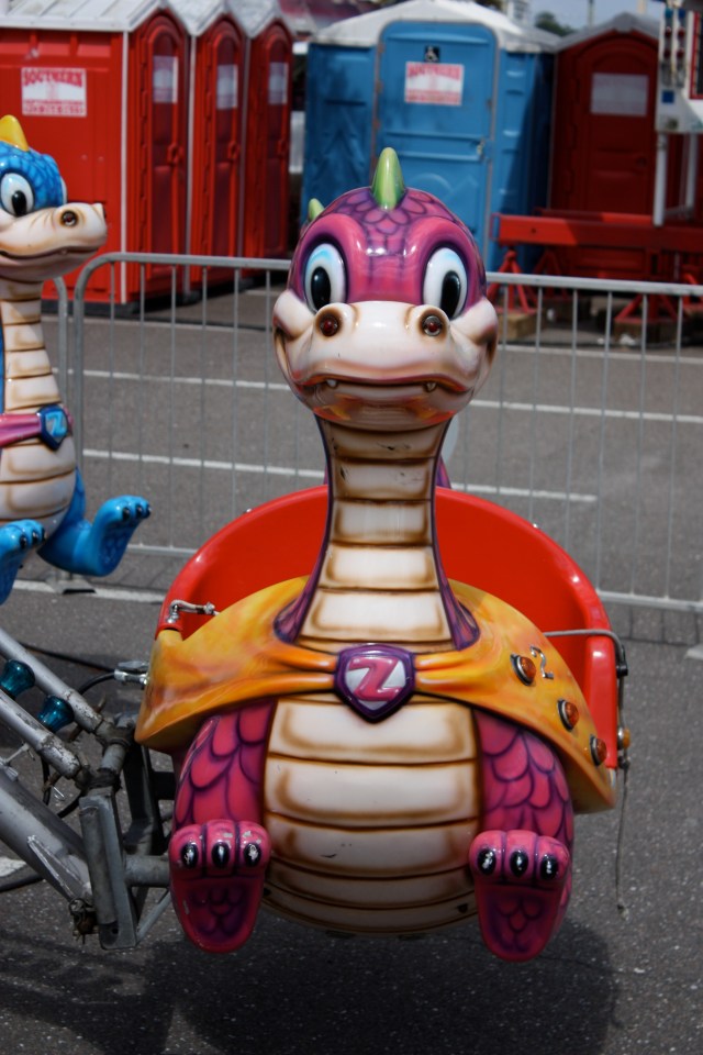 Sun-bleached, plastic toys and a broken tricycle sit next to a woman in a chair smoking outside a Duchman. A little girl crawls out from underneath. I asked if she travels with the carnival. The woman says she doesn’t know, “Babysittin’ for someone.” When asked if I could photograph the two of them, she says her skin has broken-out, “Hives, or somethin’.” Everyone is suspicious.
