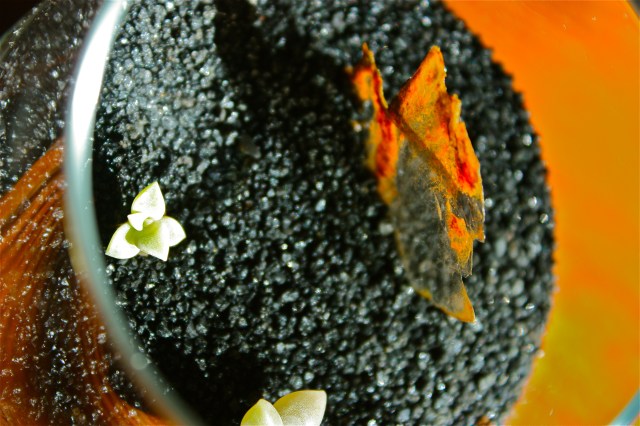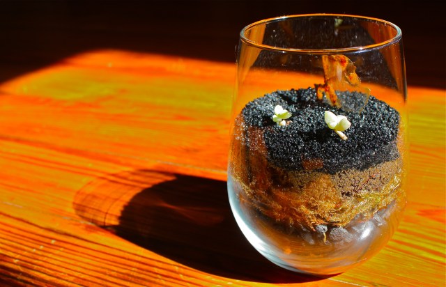 The second batch of terrariums is small but curious. Bottom-up, the layers include stones from the South Fork River near Watson Mill State Park, activated charcoal (to absorb toxins, filter air and water, and stem the growth of mold/mildew), Pacific Northwest sphagnum moss, soil from the backyard, and Hawaiian black sand. The moss was harvested from rock outcrops near Watson Mill.