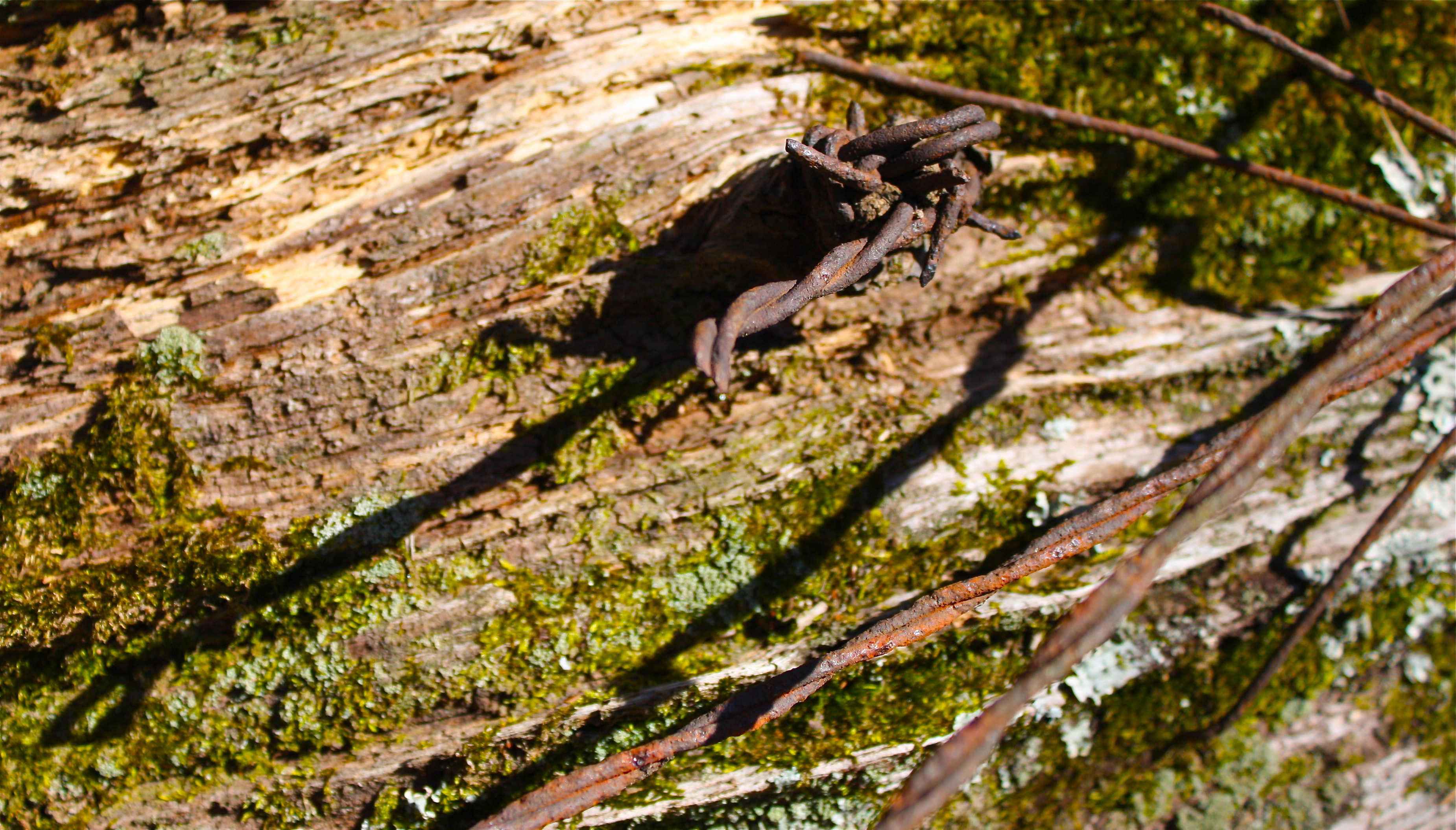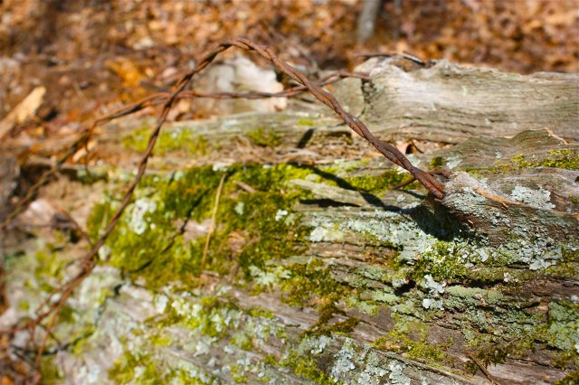 The rusty wire caught my eye first – an old fence brought down by a fallen oak. The anole was equally curious. Thank you.