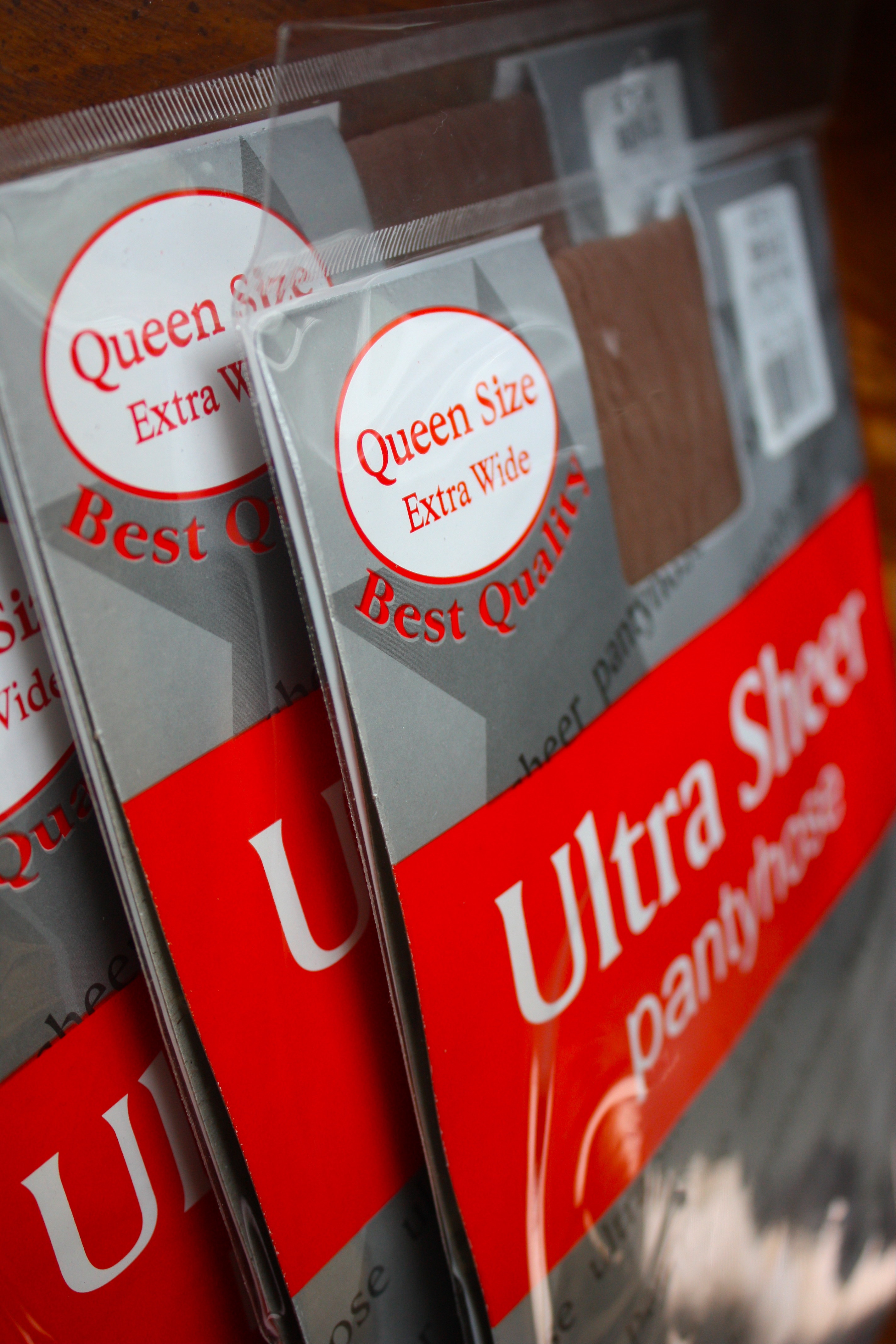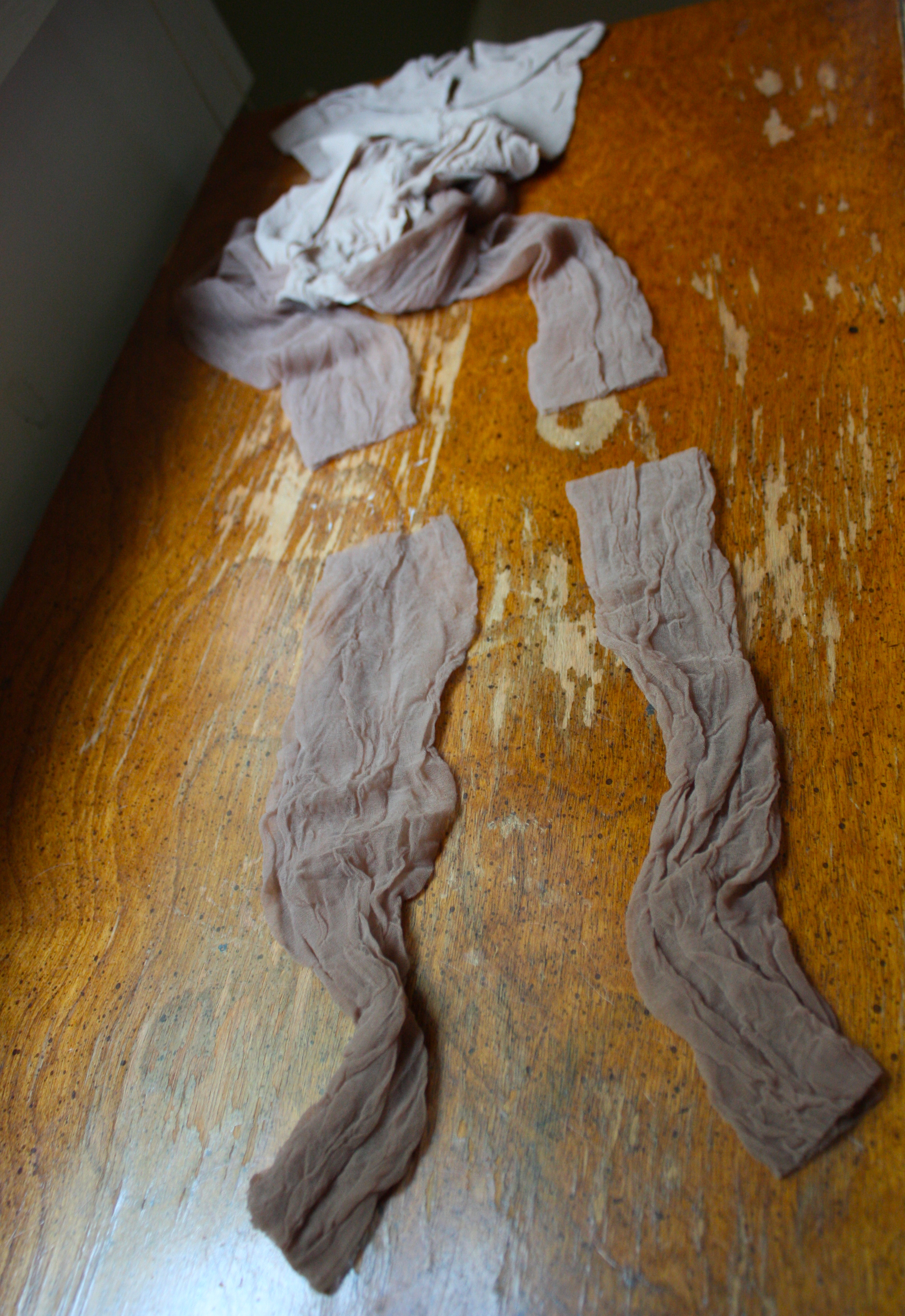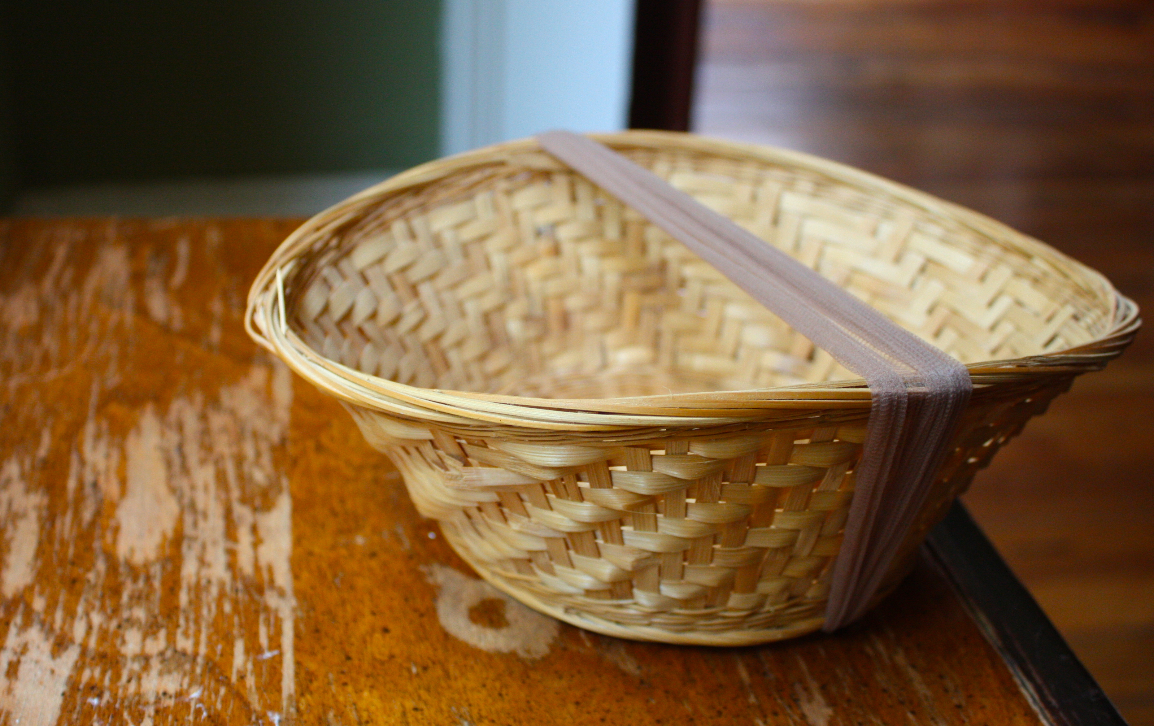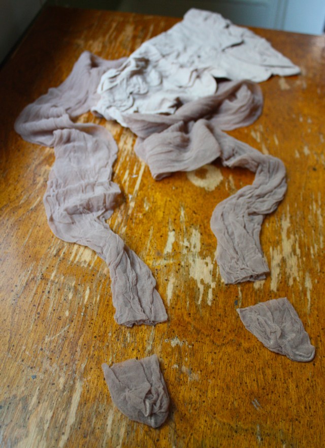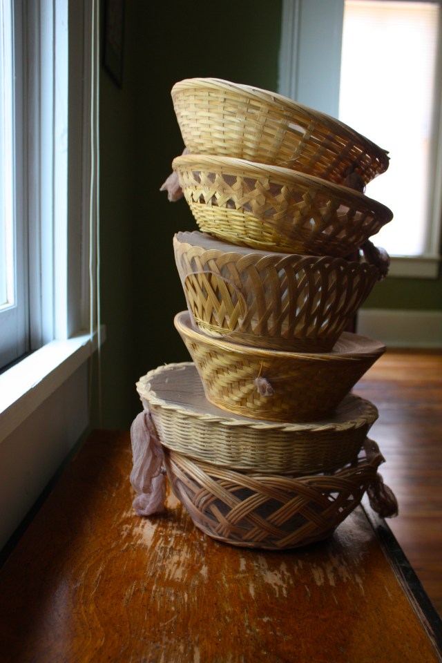 Six wicker baskets cost a dollar at the Habitat Re-Store down the street, and the queen size hose are less than two bucks. Family Dollar didn’t have large sizes, but the lady was kind enough to pull a pair out to get a better idea of how to stretch them, then she recommended the beauty supply place (Joy Joy) around the corner.