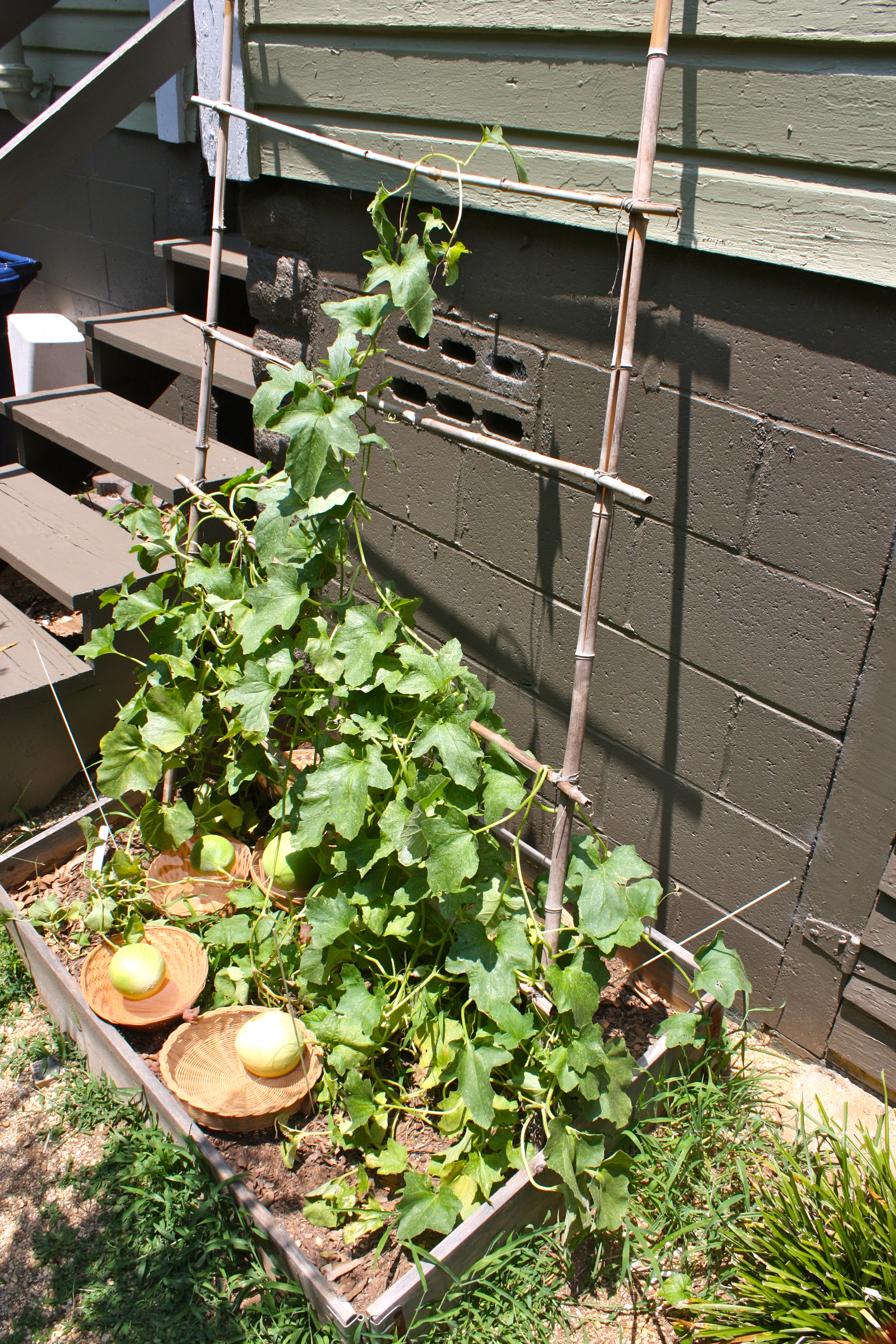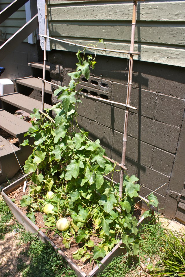 Last year’s melons were suspended in the air, each wrapped in pantyhose hammocks hung from the bamboo trellis. This year, they’ll stay on the ground, slightly elevated on improvised hosiery trampolines.