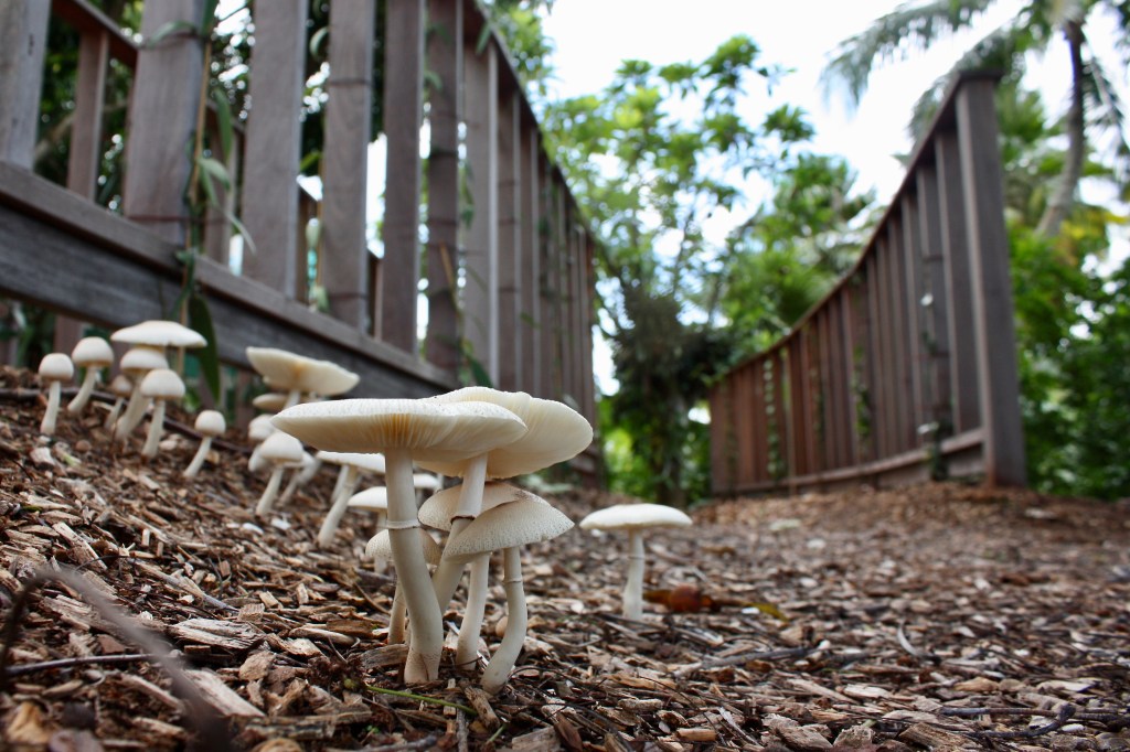 Deadly mushrooms sprout from the mulch along a path at the Naples Botanical Garden.