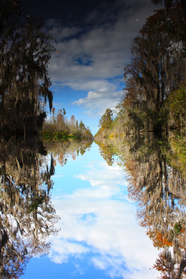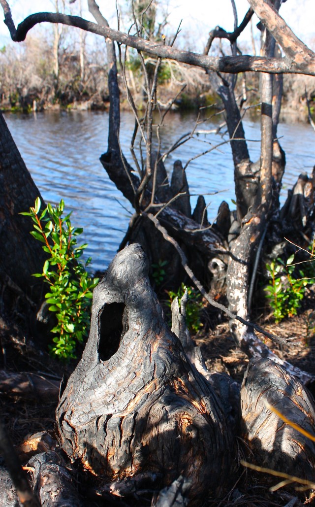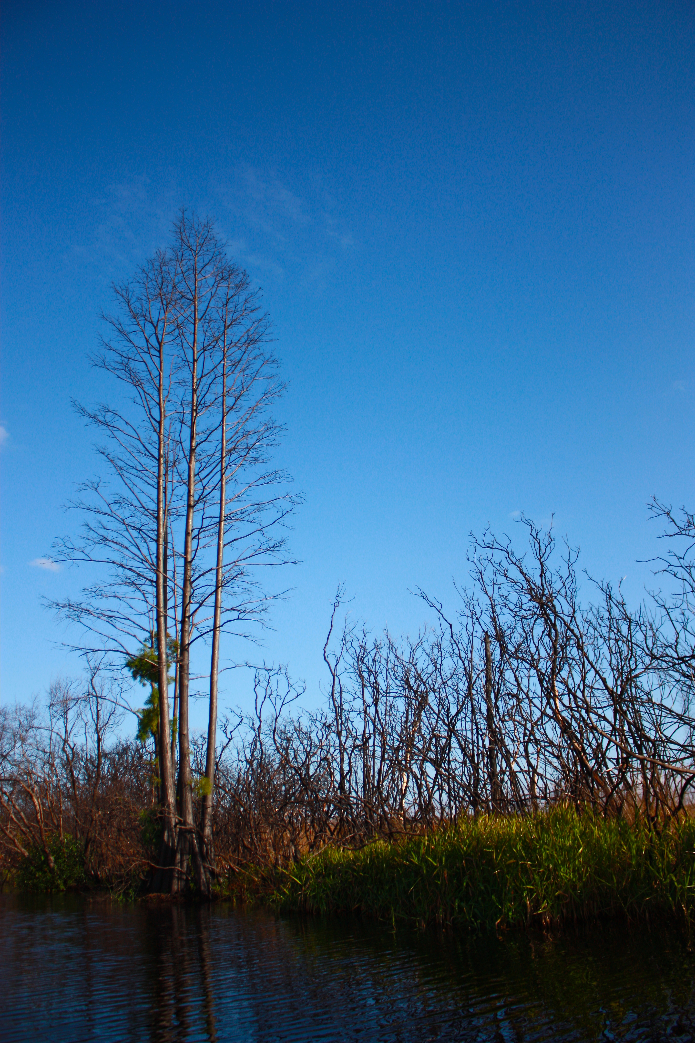 Once draped in spanish moss, naked red cypress now stand silver against the sky. New growth begins in bunches along the trunk.