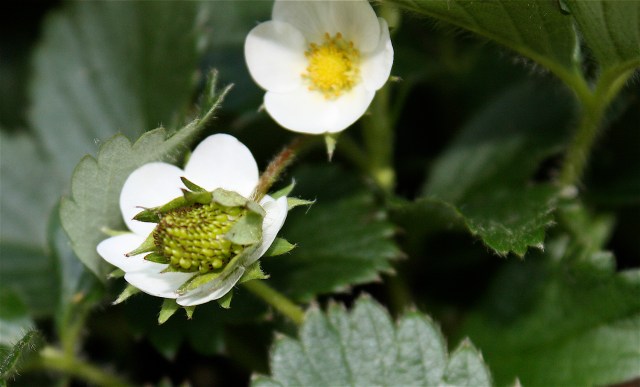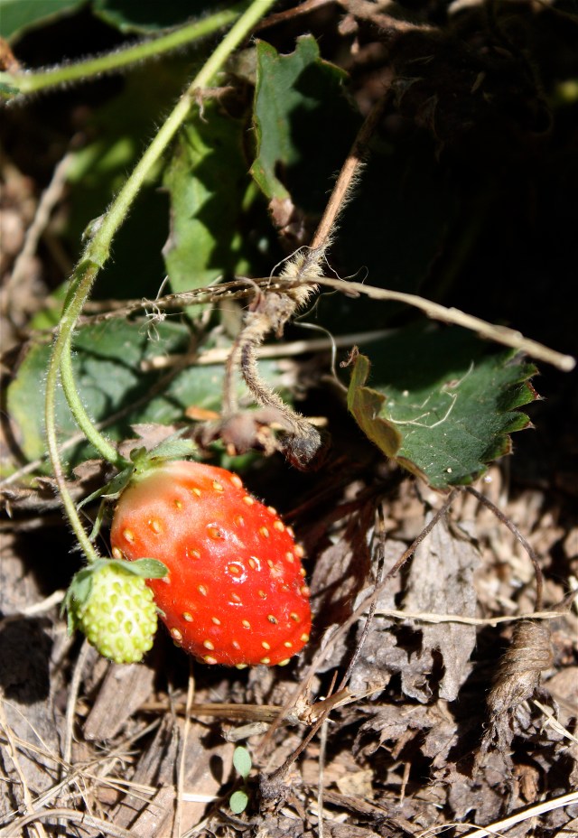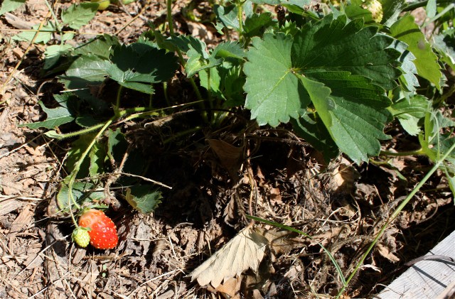 “Too late and too hot to plant strawberries,” says the man at the nursery. Back home though, last year’s plants are making a comeback, despite an invading army of weeds.