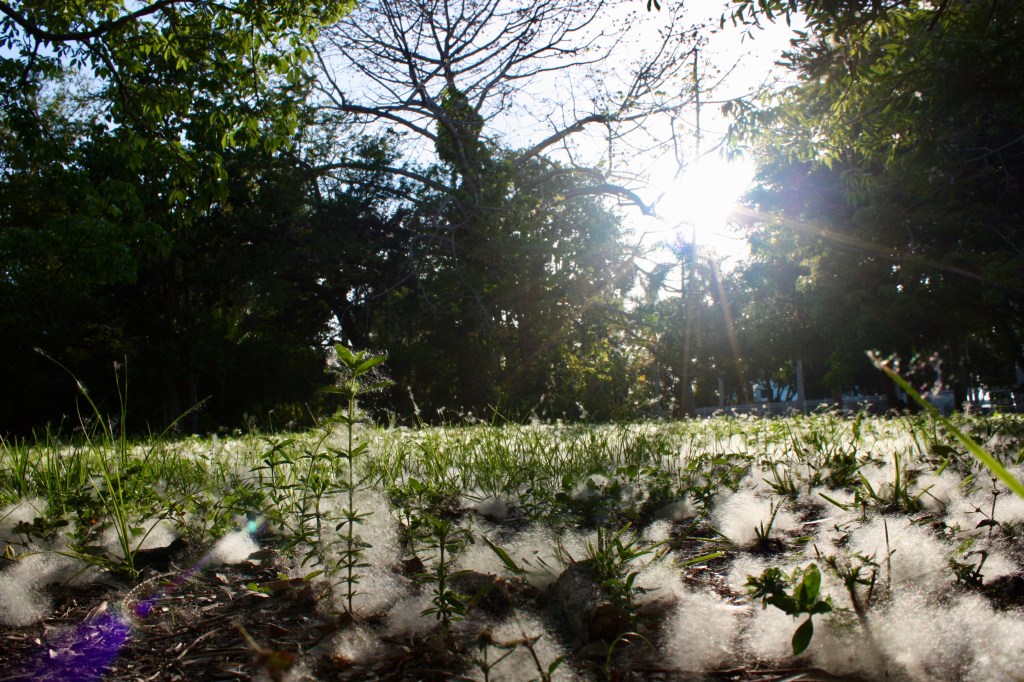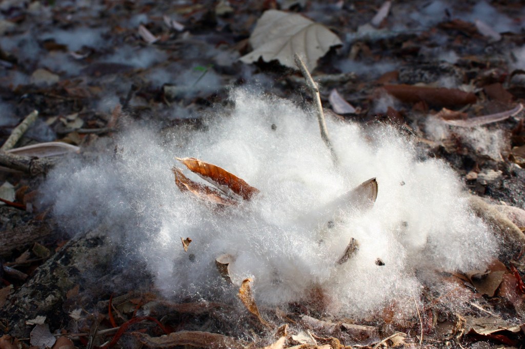 Hundreds of windblown puffballs stuck to a stretch of fence along Palm Beach Boulevard suggest a truckload of pillows exploded in a vehicle crash nearby.