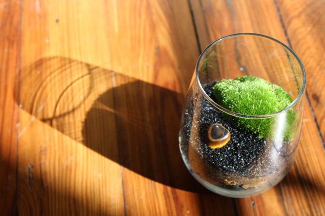 The second batch of terrariums is small but curious. Bottom-up, the layers include stones from the South Fork River near Watson Mill State Park, activated charcoal (to absorb toxins, filter air and water, and stem the growth of mold/mildew), Pacific Northwest sphagnum moss, soil from the backyard, and Hawaiian black sand. The moss was harvested from rock outcrops near Watson Mill.