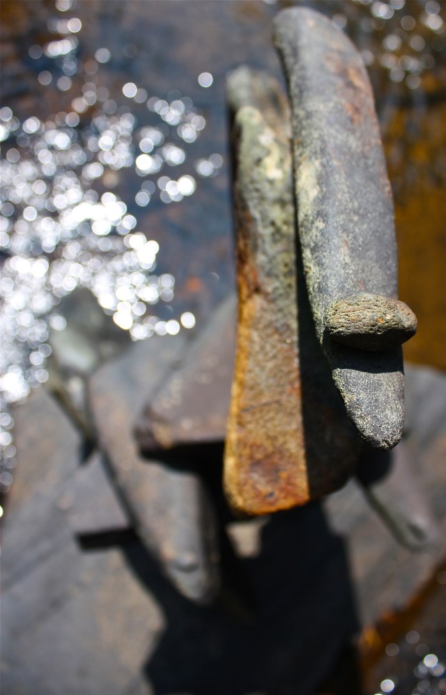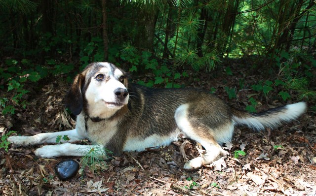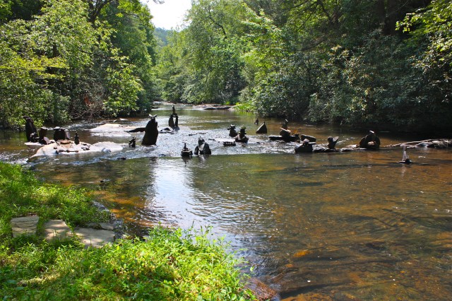 Resident trail guides Buster and Dixie collect stones from the stream, often carrying them great distances. Buster greeted the sculptures with growls and barks as the fur on his shoulders stood straight up.