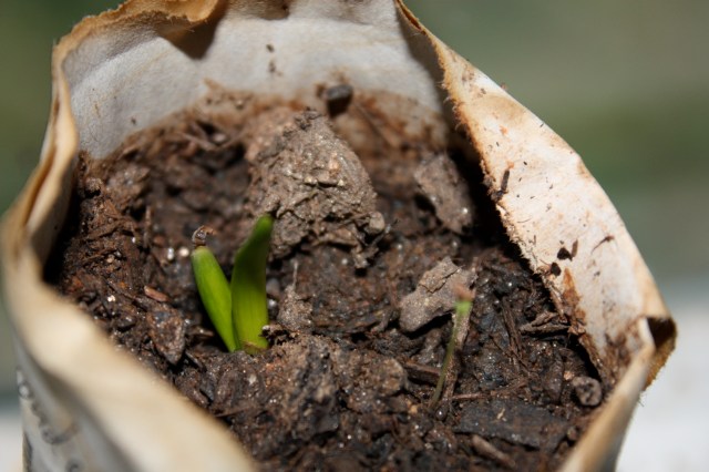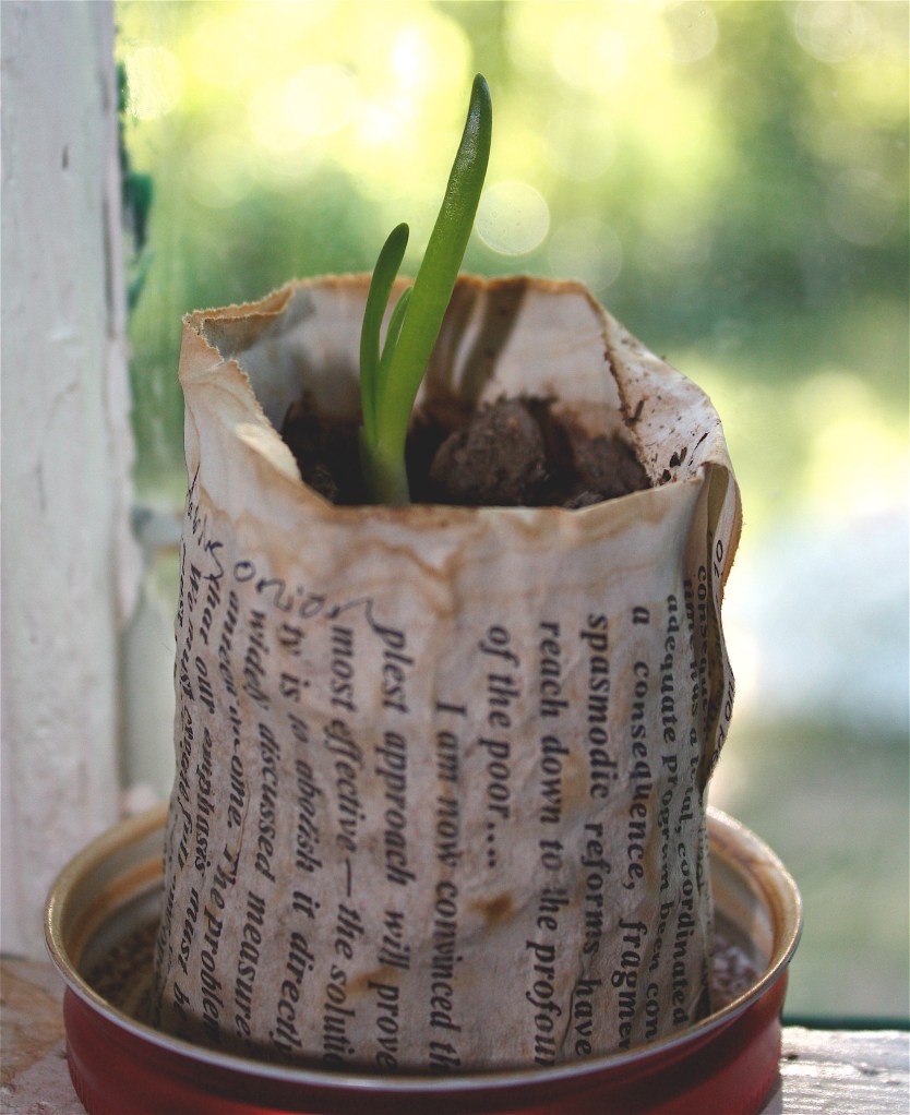 About a year ago, I snatched curious bulblets from what looked like a large alien onion plant during a walk through a nearby garden. One forgotten, dry little bulb sat on the kitchen windowsill collecting dust for a year. Until last week. I rolled a paper pot, tucked her in, then soaked. Six days later, twin jade sprouts poked through the soil.